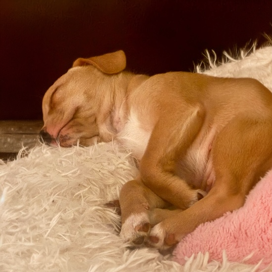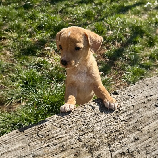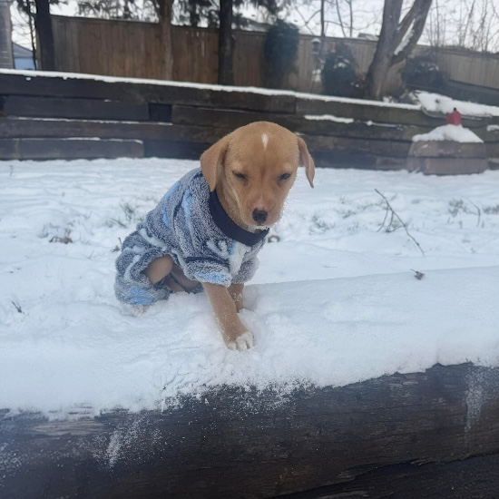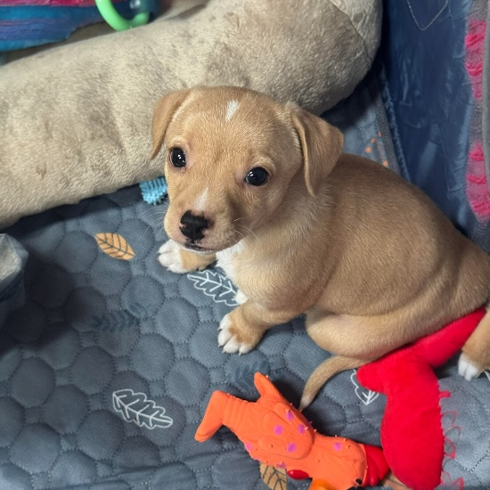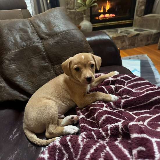 I have a soft, light tan coat with the cutest markings of white on my forehead, chest, my four paws and the tip of my tail. I love giving lots of kisses and I make cooing sounds when I get picked up and held. You might think I am growling but I am just content to be held and cannot help but express how enjoyable it feels to be held and loved. I am very active and like playing chase and tug-o-war with my siblings. My foster mom has two dogs and a cat, and I get along really well with all of them. My foster mom has been taking me outside to potty even in the cold weather. If I don’t have an opportunity to go outside, I will use a pee pad, but I am working hard on my outside potty skills! My foster mom recommends the washable kind because I like to tear up the disposable kind since they make a crinkling sound like some of my other toys!