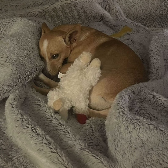 This little girl LOVES to play! Toys, chew bones, and zoomies are all on her favorite’s list. She enjoys other dogs and would happily play with them, though the older dogs in her foster home aren’t quite up for her puppy energy. She’s also very affectionate and absolutely melts for belly rubs.