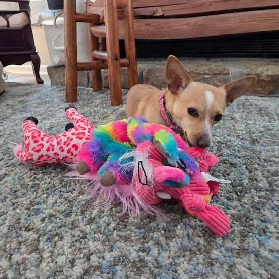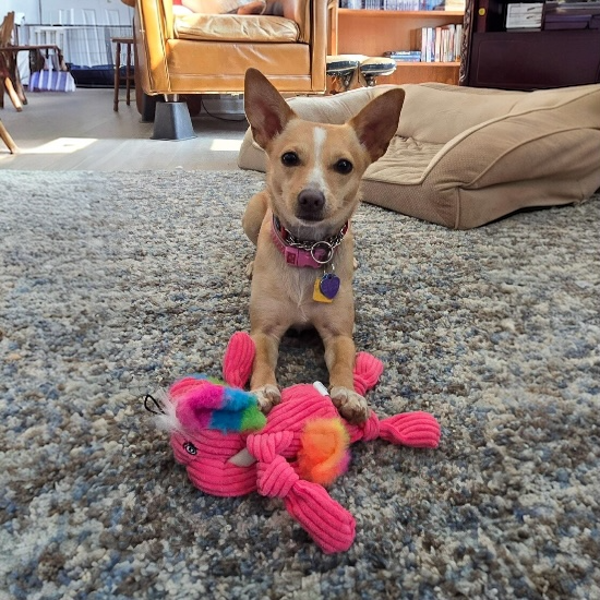 She will do best with a confident dog friend showing her the ropes and one that will play with her. Tippy’s favorite friends are her size but she also gets along with larger, gentle dogs. She does view cats as something to bark at and chase so feline companions aren’t advised!