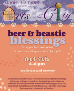 Bring your furry, feathery and scaly critters for a blessing. Meet some adorable, adoptable dogs at Crafty Bastard Brewery Emory Sunday October 5th from 4-6pm.